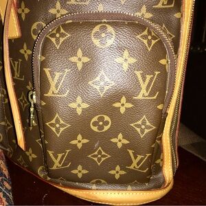 Louis Vuitton Monogram Sac Dos Bosphore Backpack. In good/fair condition. Drawstring in good condition. However, one of the backpack straps there is fraying in 2 places. One fraying spot is probably pin size and the other is probably an inch long. Please look at pictures. This doesn’t hinder the functioning of the strap…still sturdy. Clean inside of pockets and backpack. Some water spots, darkening in areas, wrinkling, and scuffing on leather. I posted pictures of everything I mentioned. FL4124