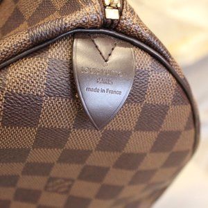 Elegant Louis Vuitton satchel. Classic checkered pattern. Durable leather handles.