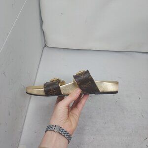 Louis Vuitton Brown Gold Buckle Bom Dia Monogram Flat Slide Sandals