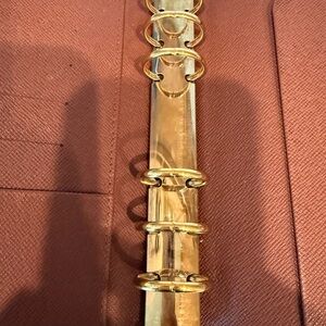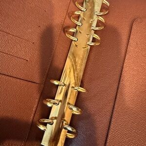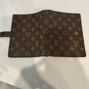 Stylish card holder with classic monogram pattern. Features a secure button closure.