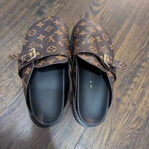 Stylish Louis Vuitton clogs with iconic brown monogram pattern. Features gold buckle detail. Worn a couple times but are in great shape.Size 9 but fit more like a 8.5.