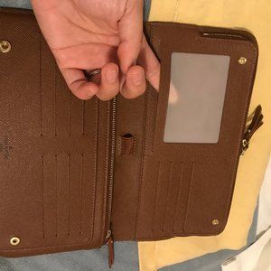 Elegant Louis Vuitton clutch. Iconic monogram design. Features a zipper detail.