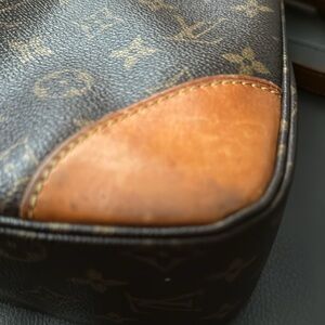Elegant hobo bag with classic monogram design. Features tan leather corners and strap.