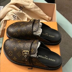 Elegant Louis Vuitton mules with iconic monogram design. Features a rich brown color with gold accents. Perfect for stylish comfort.
