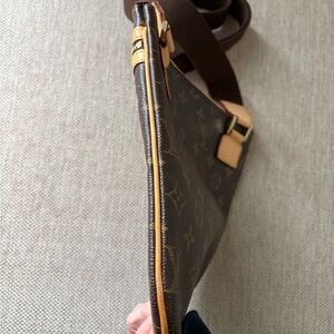 Authentic and in great condition- gently used. Experience the luxury of Louis Vuitton with this Monogram Pochette Bosphore vintage crossbody. Designed for both style and practicality, it features an adjustable strap for a comfortable fit and a gold-toned zipper for a touch of elegance. Ideal for those who value both fashion and functionality in their accessories. Height 10.75”, width 9.75”.