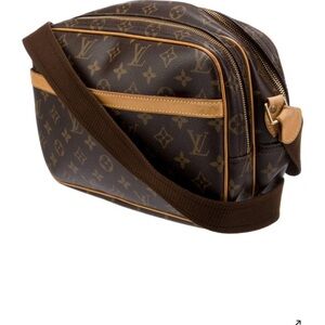 Stylish Louis Vuitton Monogram Reporter PM messenger bag with iconic monogram pattern. Features brown and tan colors. Ideal for daily use. Always have gotten compliments on this! Very faint small stains as shown in pic. Otherwise in amazing shape! I used as a crossbody but can be worn both ways. Comes with dust cover and in an LV box 🤎 See last pic for SKU and measurements:)