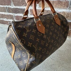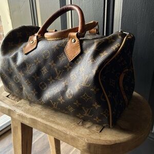 This used to have tabs (not sure what they are called) on the end, with a Louis Vuitton brass lock. The tab became torn on something, and I ended up cutting it completely off because it was hanging. Please see all of the photos. The purse is in good condition on the inside, the outside has watermarks on the patina, the lock is missing, and the tabs were cut on the end. Other than that, it is still in good condition.