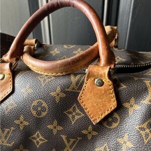 Flaws: scattered watermarks, rubbings, hairlines and darkened honey patina on the top handle. Zipper is not functioning