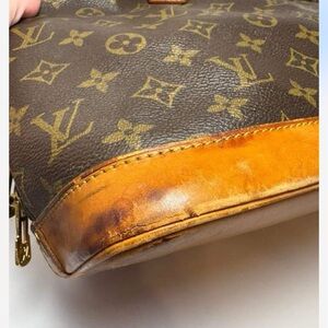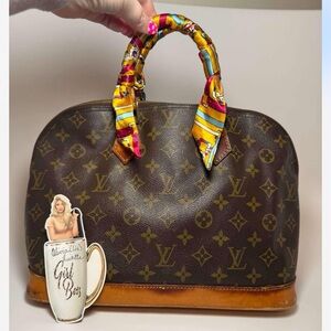 Chic satchel with iconic monogram design. Features sturdy handles and elegant style.