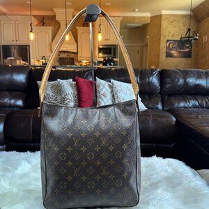 Elegant Louis Vuitton shoulder bag. Iconic monogram pattern. Comfortable tan strap.