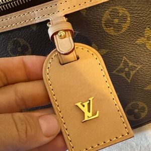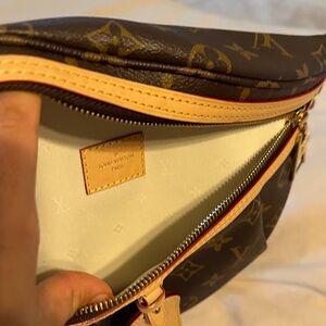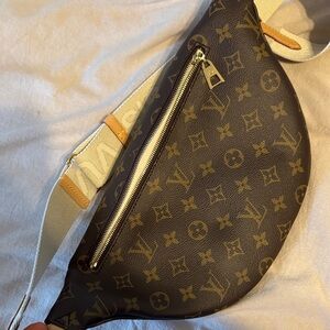 Elegant Louis Vuitton sling bag with iconic monogram. Features a cream strap and gold hardware.