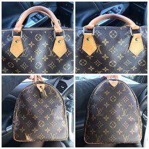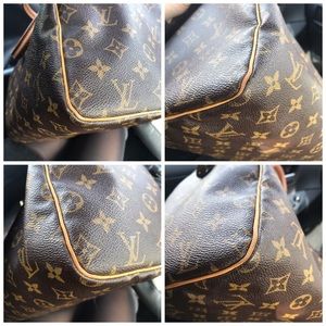 Classic Louis Vuitton monogram design. Brown leather handles. Pink fur charm not included.