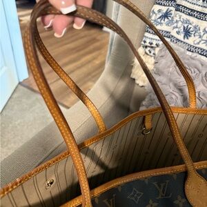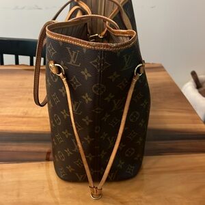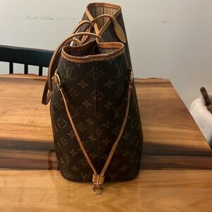 Classic Louis Vuitton Neverfull MM monogram tote. Reposhing this and added current photos. I bought it with alot of wear to the leather straps and trim including tears/cracks in the corners of the leather trim (pictured), dirt, patina (darkened leather trim), dirt and water wear. The trim is where the major wear is. The canvas is in awesome condition, no rubbing, rips/tears no piping on the corners. Inside has some marks but overall not too bad. No peeling on inside of pocket either and side straps are intact. Open to fair offers still has a lot of life left!