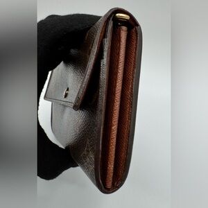 Chic Louis Vuitton wallet with signature monogram pattern. Features a deep brown hue with gold button detail.