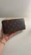 Chic Louis Vuitton wallet with signature monogram. Features a sleek gold zipper.