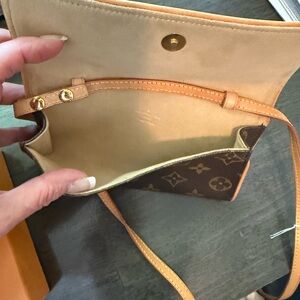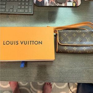 Chic Louis Vuitton wristlet with iconic monogram. Stylish and compact design. Ideal for any outing. Comes with box