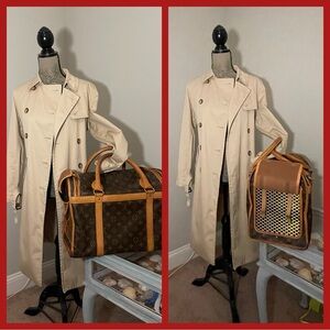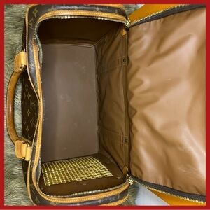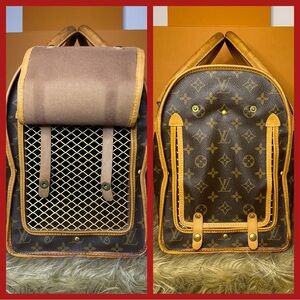 This luxurious Louis Vuitton sac chien pet carrier bag features a striking brown and tan color scheme with a dark brown monogram pattern on a lighter brown background. The bag is complemented by mustard yellow leather trim and sturdy top handles, making it a stylish choice for travel or weekend getaways with your lovable pet!