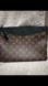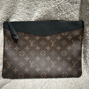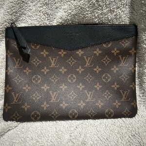Stylish Louis Vuitton pouch with signature monogram. Rich brown and black tones.