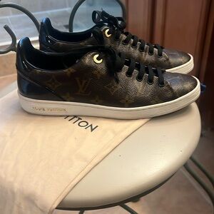 Experience luxury and style with these Louis Vuitton sneakers, featuring a sleek brown monogram pattern and contrasting black laces. The minimalist design is complemented by a white rubber sole, making them perfect for both casual and sophisticated occasions.
