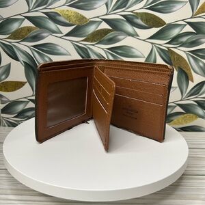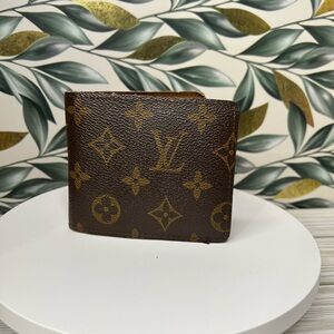 Elegant wallet featuring the iconic monogram. Rich brown leather with gold accents.