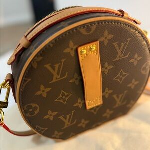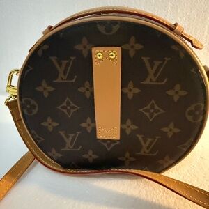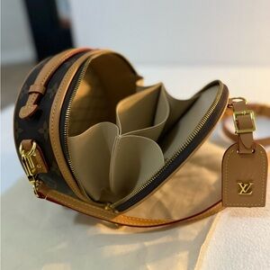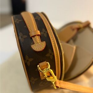 Stylish Louis Vuitton crossbody bag in brown and tan. Features multiple compartments and gold accents. Ideal for everyday use.