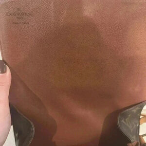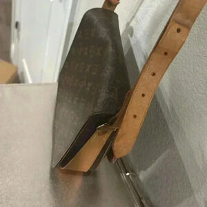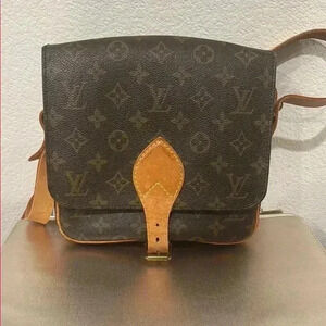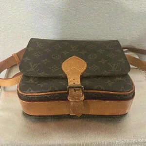 Elegant Louis Vuitton crossbody bag. Features classic monogram pattern. Brown body with tan accents. Perfect for everyday use.