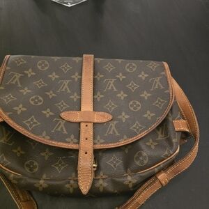 Stylish Louis Vuitton messenger bag. Features iconic monogram pattern. Adjustable tan strap. Perfect for everyday use.