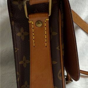 Elegant Louis Vuitton satchel with signature monogram. Rich brown leather with tan detailing. The strap that folds under has two cracks. Not breaking all the way through.