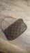 Elegant pochette with classic monogram design. Features a tan leather strap.