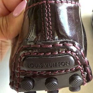 These Louis Vuitton flats showcase a sophisticated design in rich burgundy leather, highlighted by a striking gold LV logo on the front. Ideal for both professional settings and casual outings, they offer a blend of elegance and comfort. Excellent condition. Very light wear inside. No scuffs. I am original owner.