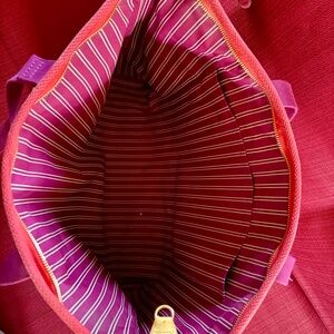 Crafted in canvas, this bag features double handles, a spacious compartment secured with a zipper, and a striped interior.