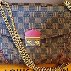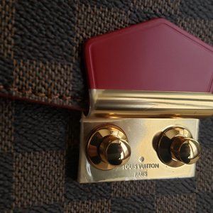 LV damier ebene coated canvas with red leather trim, features: dual button lockit closure, four metal round disc feet to protect the body of the bag,red lines that enhance the structure and shape.Chain shoulder strap can convert to a cross body strap/used as a dual strap.Opens to a three section interior with a large center zippered pocket.Lined in a soft red alcantara microfiber fabric. EXCELLENT condition, light use, plastic still on metal parts.Comes with original box, dust bag, tags, receipt