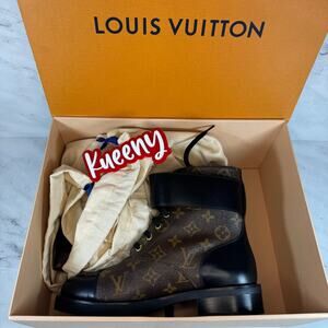 Louis Vuitton Calfskin Monogram Wonderland Flat Ranger Boots 39.5/8.5 Black New