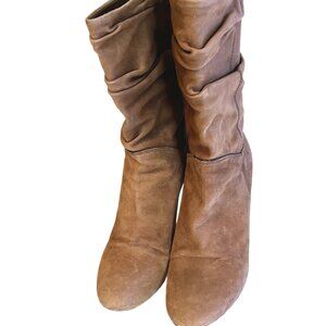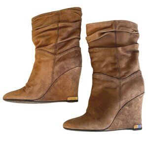 Louis Vuitton Camel Suede Slouch Wedge Boots Gold Metal Logo on Heels Size 37/ US Size 7