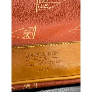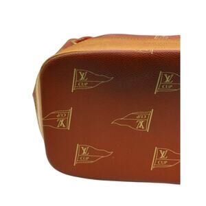 This is an authentic LOUIS VUITTON Canvas Americas Cup 1995 Saint Tropez Drawstring Bag in Red. This stylish, limited edition shoulder bag is crafted of fine brick red coated canvas, with a Louis Vuitton Cup flag motif overlay. The bag features vachetta cowhide leather trim, base, and drawstring adjustments. The top is open to a spacious cocoa brown fabric interior with a hanging zipper pocket.