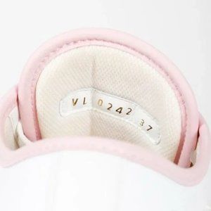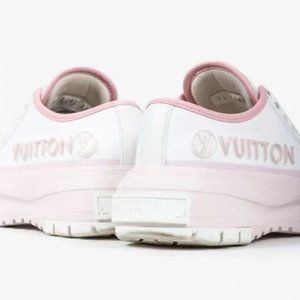 The LV Squad sneakers are crafted from white canvas with pink leather trims and feature a low-top silhouette with a rounded cap toe in white, front lace up closures, white leather insoles, and platform rubber sole in pink. Embellished with an LV circle at the padded tongue and the Vuitton name on the side, the LV Squad sneakers mix a feminine colour palette with a sporty silhouette.