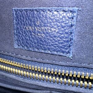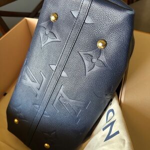 Louis Vuitton CarryAll MM cowhide leather bag in Navy Blue. It’s part of the Nautical Collection with the giant Monogram. It goes with anything and can hold everything. Worn on the bottom corners. Original Box and dust bag.