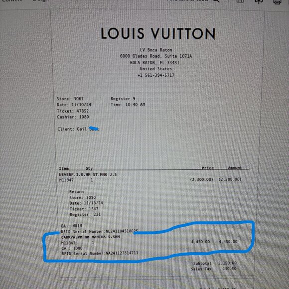 Purchased in Nov. 2024 at $4,450.00 plus tax (see receipt-I exchanged another bag for this one)