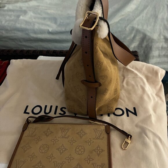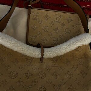 Authentic Louis Vuitton CarryAll PM in Beige Mahina suede with shearling around the opening collar and leather trim