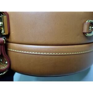 • This chic hat box inspired bag is crafted of sturdy brown calfskin leather, with a whimsical overlay of cats and dogs. The bag features an adjustable top handle with a polished brass press lock closure, and an optional, adjustable shoulder strap with matching brass hardware. The bag opens to a smooth beige leather interior with a simple patch pocket, and room for your phone and essentials,