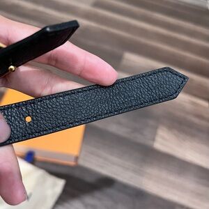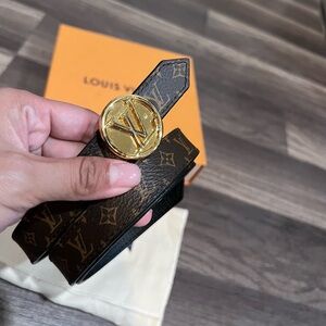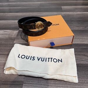 Sophisticated Louis Vuitton belt in black with iconic gold emblem. Perfect for a refined look.