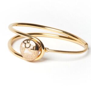Unique LV gold tone bracelet featuring an enamel adornment overlaid with House codes. Magnetic closure. Designer hallmark and GP 0089 code on back of charm. Exceptional condition!