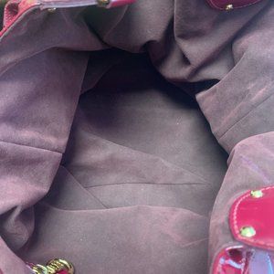 I have for sale a red Louis Vuitton Cerise Mahina Patent Leather Surya Bag in very good condition. The exterior of the bag is in excellent condition. Even the bottom of the purse is practically scuff free. There is some Minor scuffs and or "dents" in material on the area attached to rings that hold handles. I can't find any issues with the actual exterior of this Cerise. Interior has some minor spots but will clean up nicely and is in great shape. No tears and has dust cover that is in terrific shape. No Box, however. Appears to be approximately 18" wide X 11" High X 10" I use Entrupy as my Authenticator and you can see in one of the pictures the Certificate of Authenticity. I believe this is the XL size?? Manufactured in 25th week of 2009.