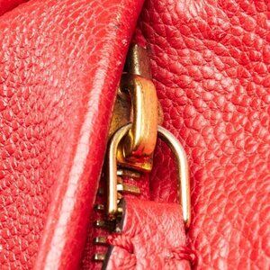 The exterior leather is clean and beautiful with creasing throughout and faint scuffing. The bag appears to have some discoloration and feels a bit stiff to the touch. The leather top handle and shoulder straps have faint signs of wear. The goldtone hardware is bright and crisps with some scratches and fading. The interior has a few spots on the lining and signs of light use. Overall it remains in good condition with some signs of wear.
