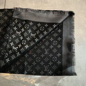 Luxurious Louis Vuitton shawl with signature monogram. Features elegant charcoal tones.