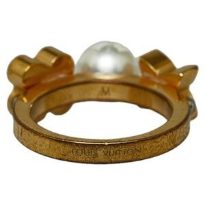 The ring is adorned with a lustrous pearl at its centre, flanked by the iconic Louis Vuitton motifs – a four-petaled flower and a star, both crafted in gleaming gold-tone metal. These symbols are beautifully accented with delicate metallic studs, adding a touch of intrigue and texture to the piece.