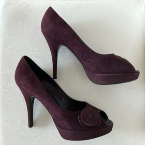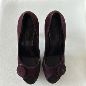 Beautiful Louis Vuitton open toe platform pump with 4 1/2” heels. Vintage edition, never worn comes with 2 extra heel posts. Aubergine suede. Shoes are in great condition, the box is worn. Size 7.5