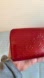 Luxurious Louis Vuitton Long Vernis wallet in cherry red. Features iconic monogram embossing. Sleek and stylish design.