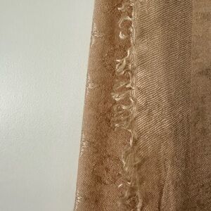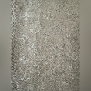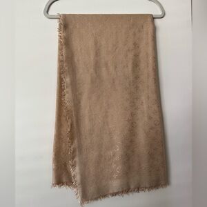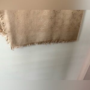 Chic Louis Vuitton shawl with iconic monogram. Light tan hue with delicate fringe. Some damage to the fringe pictured. Could be worn as is, or combed or cut if it bothers you. 100% authentic, purchased from LV in the Domain in Austin, TX. This is pretty large, I wore it mostly as a shawl over my shoulders, beautiful & neutral color that goes with almost anything. Tag is still intact. 56.1” x 56.1” - silk & wool blend. I believe this is the “ecru” from LV but in person it’s a light tan. Added additional photos with natural light, there are no stains that is just a shadow.