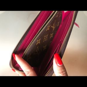 Coated canvas monogram and fuchsia grained cowhide leather lining and trimming.